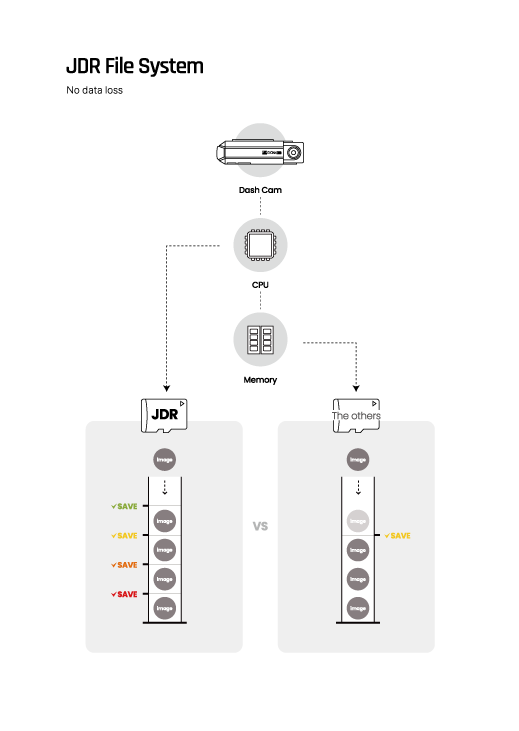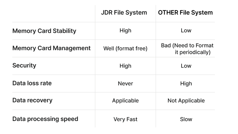 Unlike conventional dash cam file systems, JDR ensures stable recording without the need for periodic formatting.