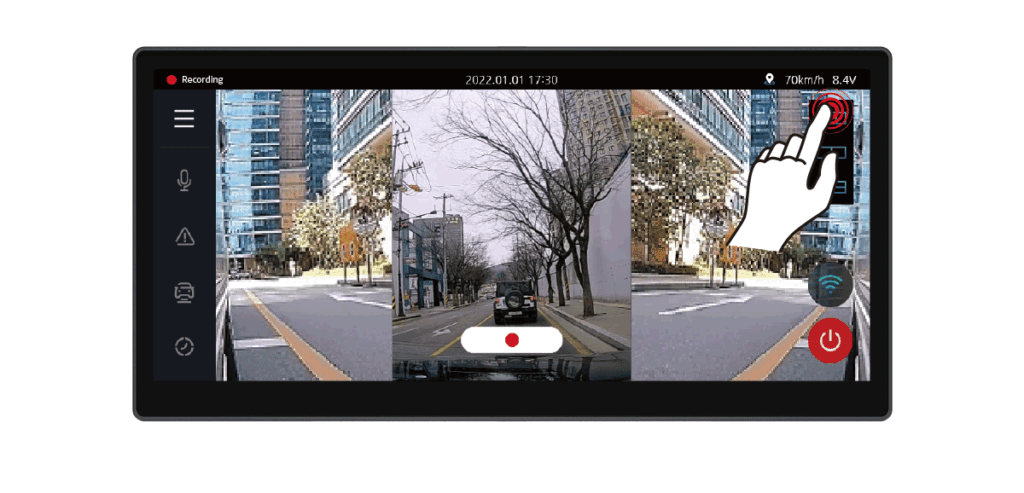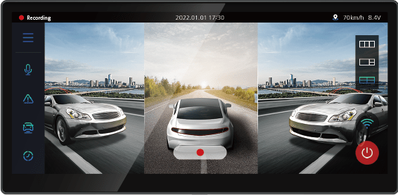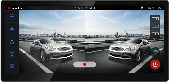 The Real-time video, Play recorded video, Dash Cam Settings and memory card with smart GUI can be managed directly from the front camera without PC connection.