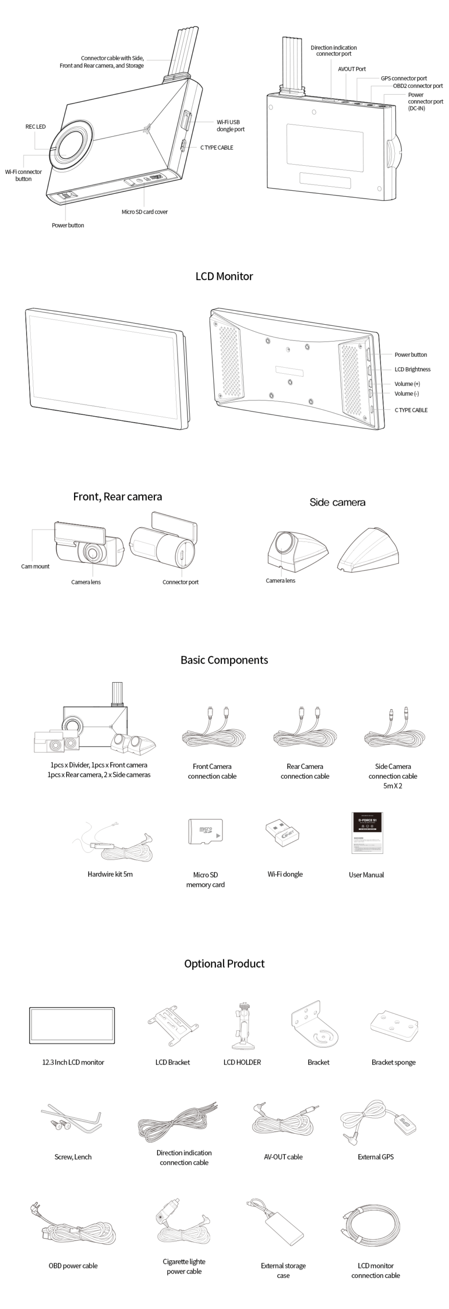 | Dimension (WxHxD, mm) | LCD Monitor: 308.2×131.5×29.4MM 12.3Inch Divider: 120×74.8x18MM Front, Rear camera: 59.5×39.8×31.2MM Left, Right camera: 24.5×34.5x54MM |